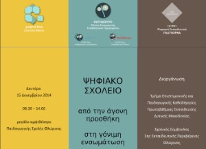 Στα πλαίσια των επιμορφωτικών μας δράσεων διοργανώνουμε ημερίδα με τίτλο «Ψηφιακό Σχολείο: από την άγονη προσθήκη στη γόνιμη ενσωμάτωση» τη Δευτέρα 15 Δεκεμβρίου 2014, ώρες 08.30 – 14.00, στο μεγάλο αμφιθέατρο της Παιδαγωγικής Σχολής...