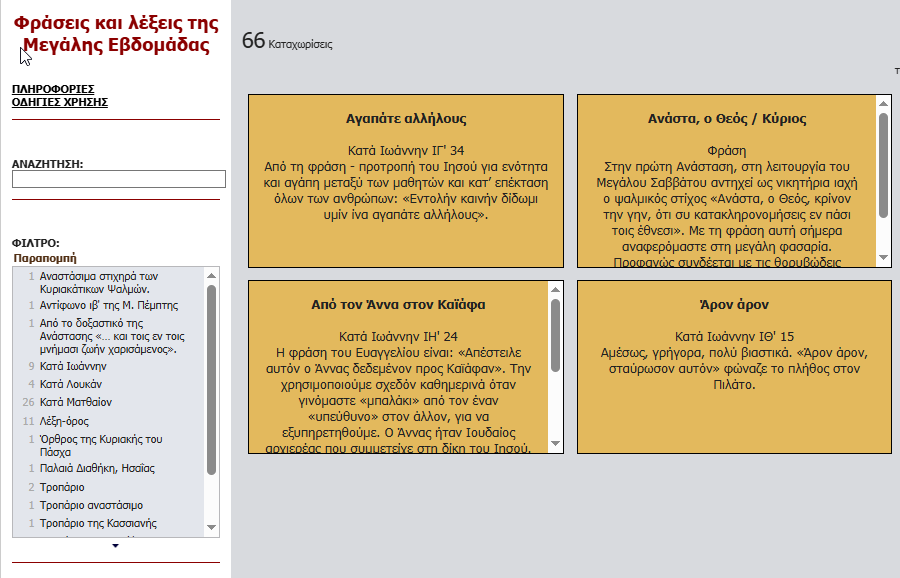 Η εφαρμογή αφορά φράσεις και λέξεις προερχόμενες από τα κείμενα των Ευαγγελίων και από την ποίηση που χαρακτηρίζει την υμνολογία τής Μ. Εβδομάδας και οι οποίες έχουν εντυπωθεί στη μνήμη και έχουν περάσει στη...